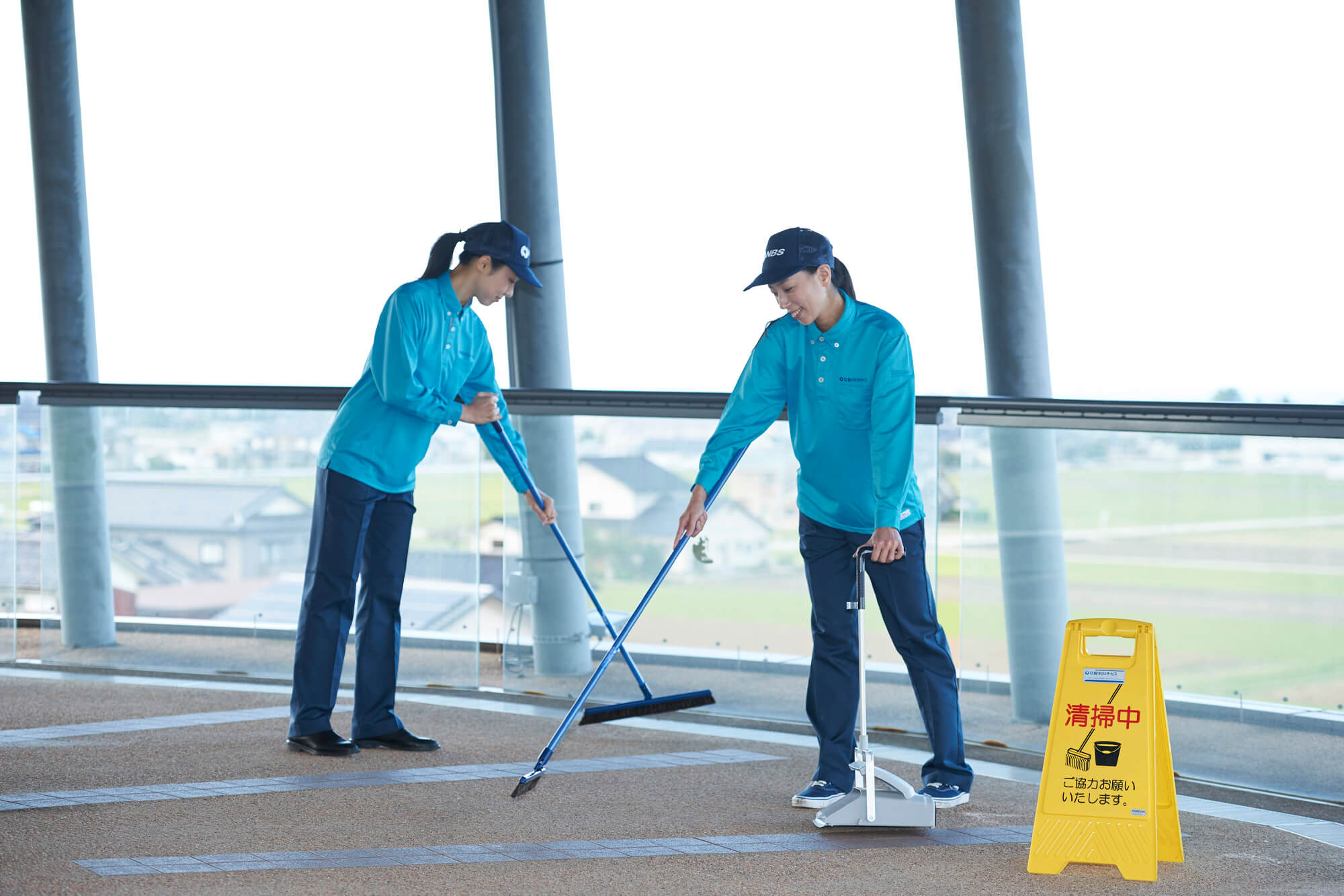 ・公民館、図書館、ホール、トイレ等および屋外見回り清掃を、作業員2名で分担作業します